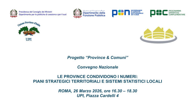 Lo scorso 26 marzo si è svolto a Roma presso la sede dell’UPI in Piazza Cardelli il convegno dal titolo “Le Province condividono i numeri: piani strategici territoriali e sistemi statistici locali”. L'evento si inserisce nella cornice del progetto nazionale “Province & Comuni – Le Province e il sistema dei servizi a supporto dei Comuni”, un’iniziativa finanziata dal Programma Azione Coesione Complementare al PON Governance e Capacità Istituzionale 2014-2020.