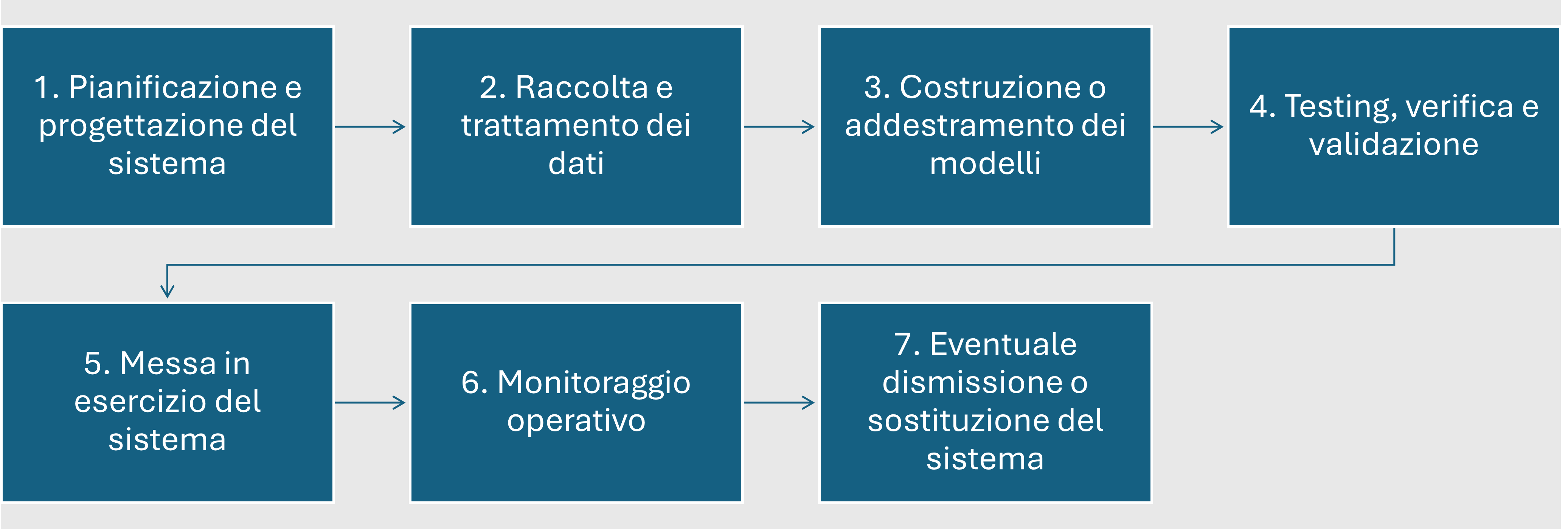 Per quanto riguarda lo sviluppo e la gestione dei sistemi di IA, vengono identificate le seguenti fasi.