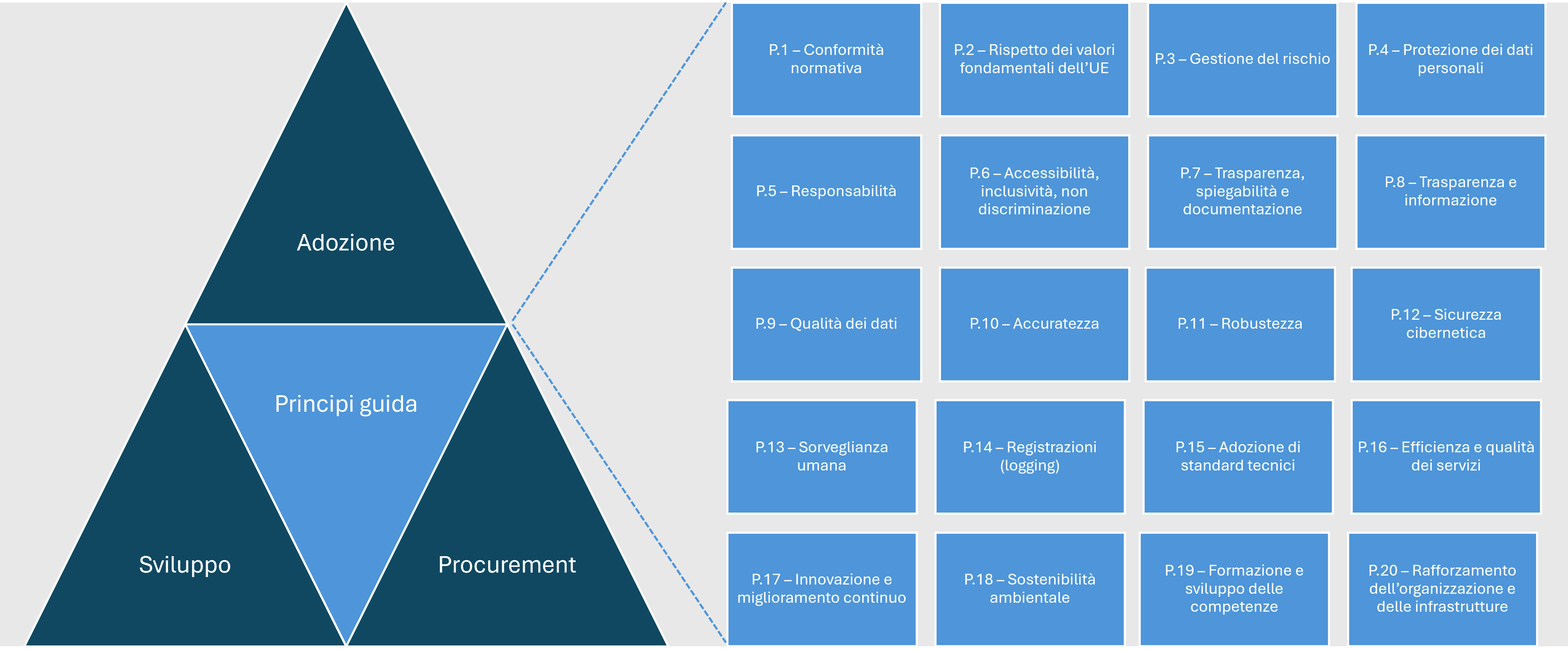 Le linee guida individuano 20 principi che collegano le tre dimensioni fondamentali dell’intelligenza artificiale nella PA: adozione, sviluppo e procurement.
